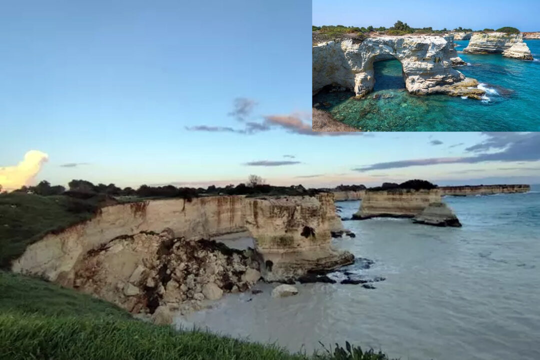 Il maltempo degli ultimi giorni lascia ferite profonde in diverse regioni italiane. In Salento è crollato uno dei tratti più iconici della costa: l’imponente arco dei faraglioni di Sant’Andrea, a Melendugno, in provincia di Lecce, noto anche come “arco dell’amore”, si è sbriciolato finendo in mare.